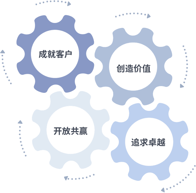 成就客户是一切决策的出发点,,创造价值是衡量所有工作的标准,,,追求卓越是我们做事做人的态度,,,,开放共赢是我们的格局也是最终的结果。。。价值观的齿轮环环相扣,,,,推动着组织里的每个人不断向前。。