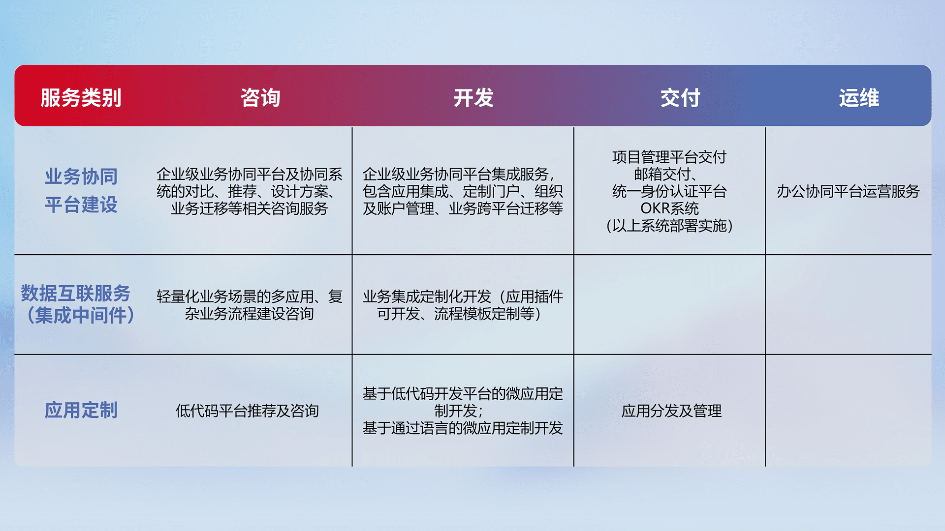 针对钉钉、、、企微、、IDaas等平台级产品提供产品的规划、、方案、、、、交付、、定制化开发等服务,,实现如统一协同办公、、智能客户服务、、、、混合会议管理、、、智能数据查询、、、、等业务场景,,,实现数字化转型。。。